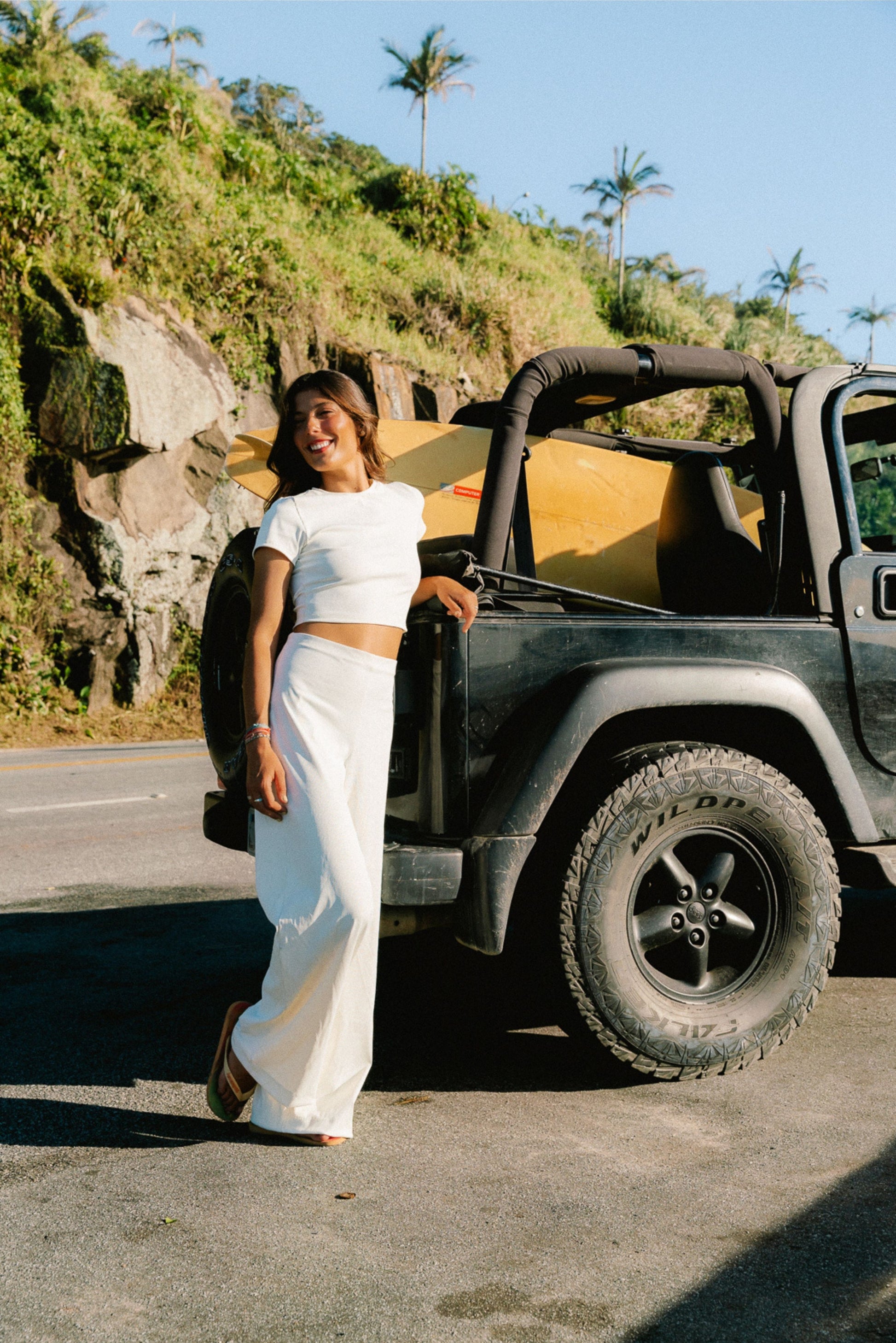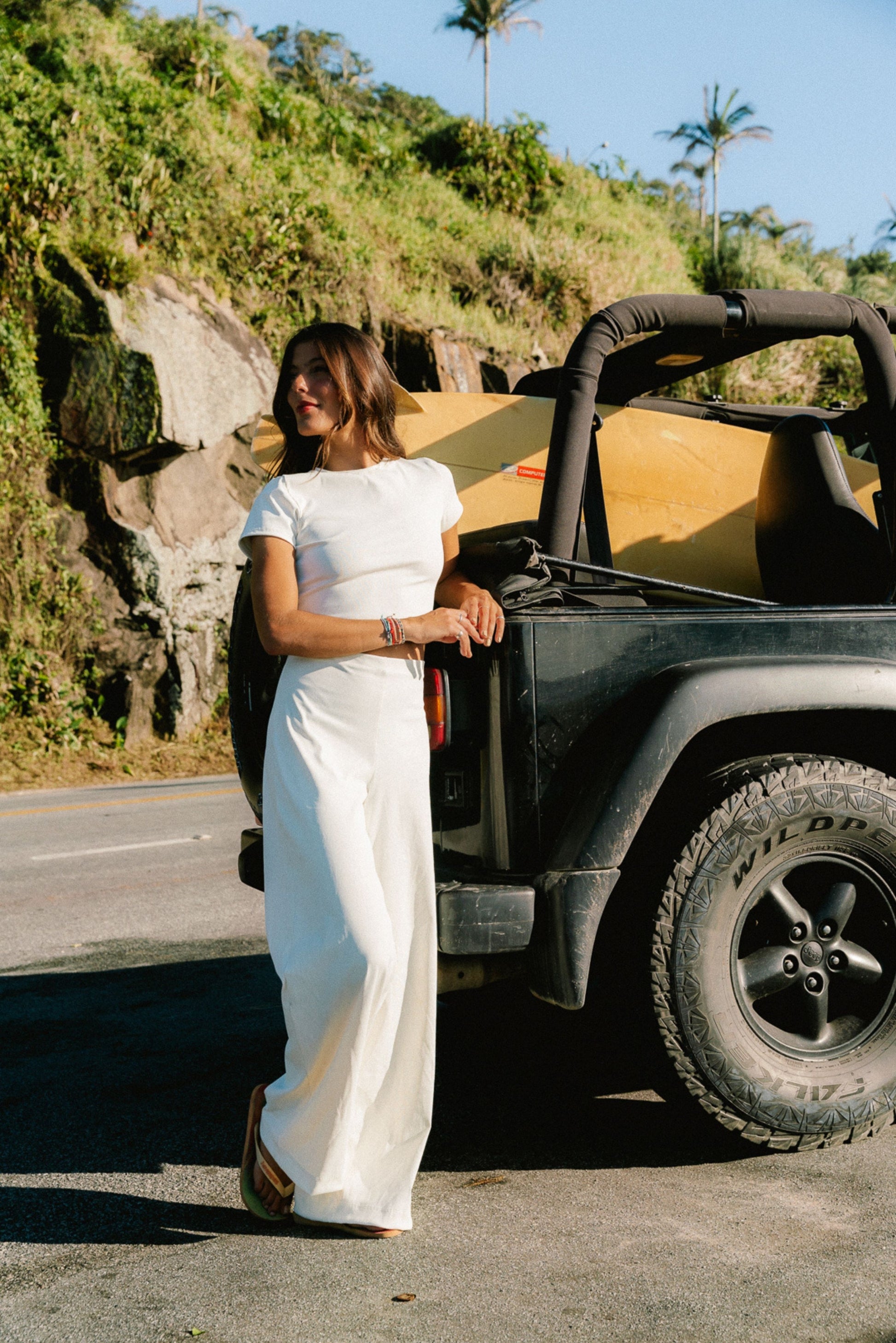 Calça wide leg, confeccionada em tecido canelado composto de poliamida e elastano, com toque macio e caimento fluido. De cintura alta e cós reto, valoriza a silhueta enquanto garante conforto. A modelagem ampla, que se mantém desde o quadril até a barra, cria um visual moderno e versátil — perfeito para compor desde looks casuais até combinações mais arrumadas.